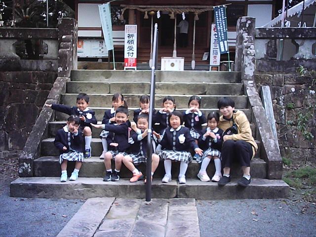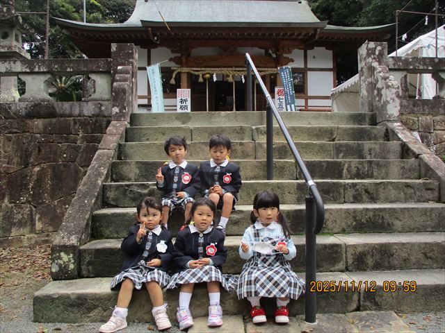 11月12日(水)に阿蘇神社に七五三のお参りに行きました。子ども達は少し緊張しながらも、ここまで大きくなったことの感謝と、これからも元気で過ごしていきますので見守っていてくださいという気持ちを込めて参拝することができました。