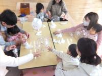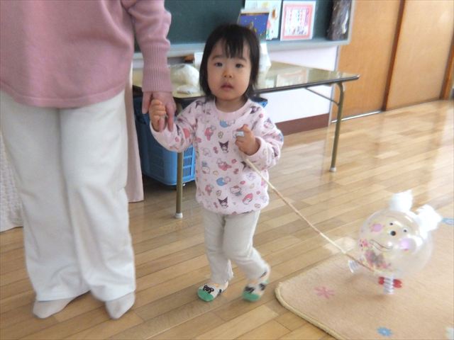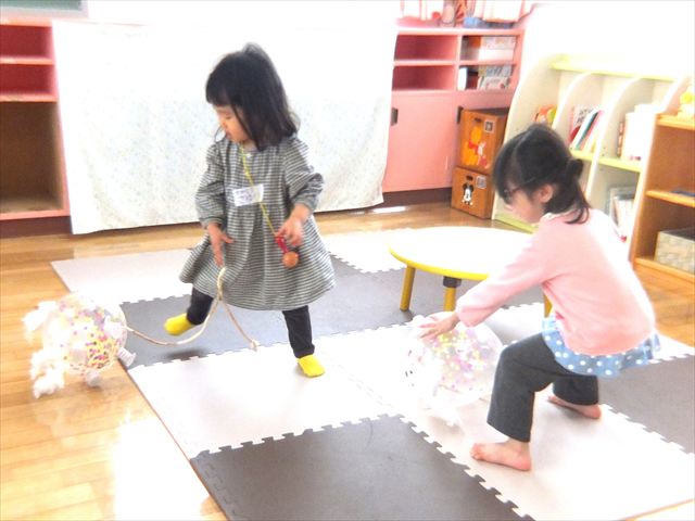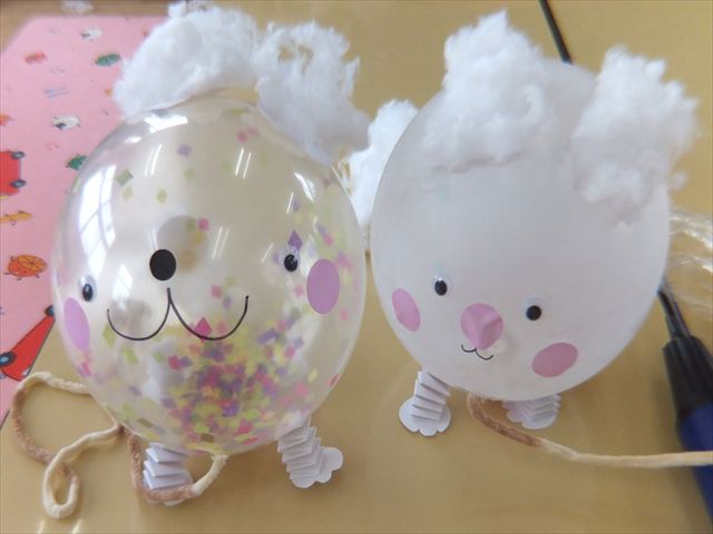 2月5日(木)のつぼみくらぶは、ふうせんを使ってうさぎを作りました。顔のパーツを貼ったり、耳やしっぽを綿でふわふわにしたり、伸びる足をつけたりして雪ウサギの出来上がり。紐をつけてみんなでお散歩をして楽しみました。