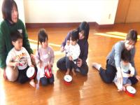 1月22日(木)のつぼみくらぶは、「でんでんだいこ」を製作しました。アンパンマンと鬼の顔をシールを貼ったり花紙を丸めたりして作りました。それぞれにいろんな顔が出来上がって、「トコトントコトン」と上手に鳴らして遊びました。そして、お部屋でアンパンマンたちの「ふくわらい」も楽しみました。いろんな顔が出来て楽しく遊びました。