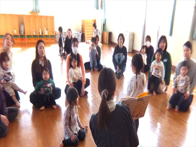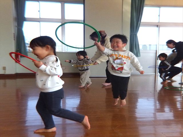 2月12日(木)のつぼみくらぶは、今年度最後のリトリトさんの「リトミック」でした。体も少しずつ大きくなり、しっかり歩けるようになってきた子どもたち。ピアノの音をよく聴いて歩いたり止まったりできるようになりました。線路ではリズムに合わせてジャンプも上手にできました。また、「おおきい」「ちいさい」やタン、タン、タンのリズムを太鼓で叩いたりもしました。一年を通してたくさん音を楽しみました。来年度も5月から毎月予定しています。ぜひ親子で楽しい音楽を味わいましょう。