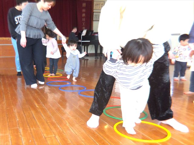 1月29日(木)のつぼみくらぶは、未来こども体育教室の迎先生と親子体育を行いました。ハイハイ・お膝歩き・くまさん歩きをしたり、ステップを上ったり下りたりと楽しく何度も何度も繰り返していました。今回は鉄棒を利用してぎゅーっとにぎってぶら下がりも頑張りました。ママやパパと一緒だと楽しくてたくさん体を動かしてあっという間に温まりました。