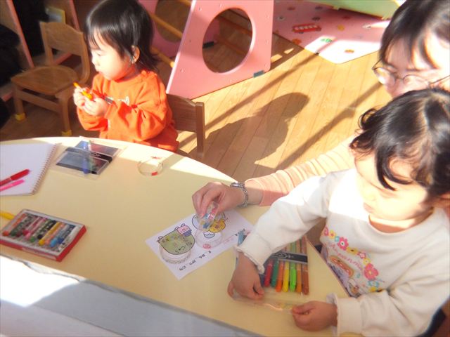 2月19日のつぼみくらぶは、今年度最後のつぼみくらぶでした。「フリーデイ」だったので部屋と園庭の遊具でたくさん遊びました。また、透明プラスチックに絵を描いてブレスレットを作ったり、おおきくなったかな?と身長や体重を測ったりといろんなことをして楽しみました。