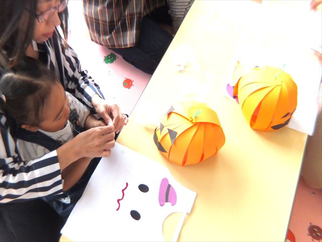 来週のつぼみくらぶは、「ハロウィンパーティ」です。今日もかぼちゃの服着てかわいかったですが、来週はおばけの服やかぼちゃの帽子を作ったりしますよ〜。お楽しみに!!(募集は締め切りました。)