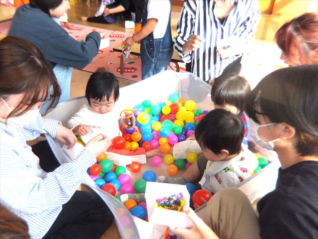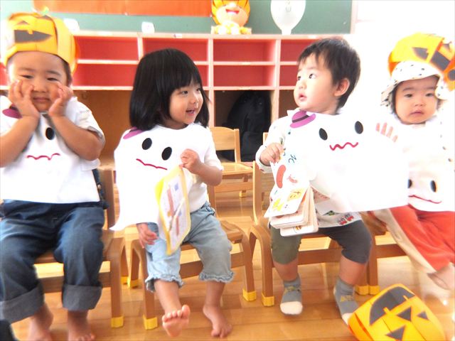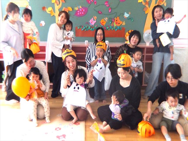 10月23日(木)のつぼみくらぶでは、かぼちゃの帽子やおばけの服を製作したり、ボールの中から目玉のボールを探すゲームやおばけとお散歩したりしました。キャンディも「ちょうだい」とお友だちのママを回って歩いてもらいました。最後に本当のお菓子ももらって集合写真も撮って楽しいパーティとなりました!
