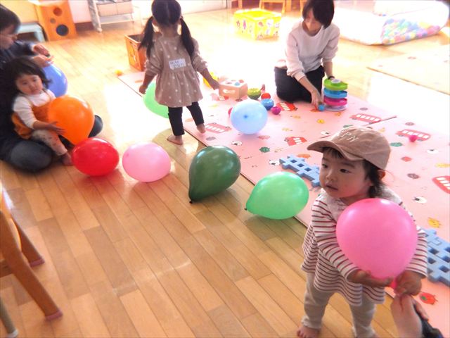 ボールに乗ったり転がしたり、絵本から飛び出した魔女のほうきに乗ったりお掃除したり、蜘蛛の巣の中に入ったりとハロウィンの世界も楽しみました。ピアノの音をよ〜く聞いて、歩いたり走ったり止まったりがどんどん上手になってきている子どもたちです。