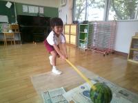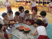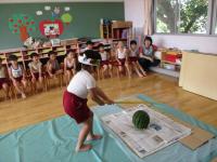 夏期保育ではすいか割りやプール遊びを行い、甘くておいしいスイカを食べたり水の気持ちよさを感じたりながら夏ならではの活動を楽しみました♪